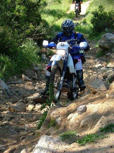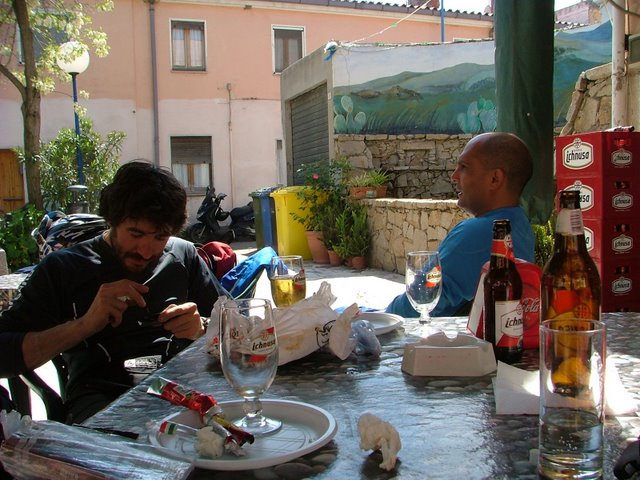 La 3 Giorni! Un sogno prima proposto (due anni fa) poi immaginato, poi anelato, agognato, desiderato e… Quasi realizzato. Quasi? Si, quasi, almeno per quello che mi riguarda. Ma andiamo in ordine cronologico: giovedì 23 metto in ordine la moto, lavata, oliata, ingrassata, ecc. ecc. preparo il bagaglio, zaino alloggiato sul portapacchi a mezzo "Ragno" e impermeabilizzato da bustone N.U., mini zainetto Camelbak in spalla, marsupio in vita, tutto pronto. Parto da casa puntuale e raggiante! Una giornata bella di sole senza vento e calda. Appuntamento con il plotone alle 10.00, alla curva degli Eucaliptus mi affianca Giorgenne proveniente da Iglesias, arriviamo e troviamo Stefano, nostra guida, seduto al tavolino con la tazzina di caffè vuota. Prendiamo posto ed ecco che arriva anche Danilo. Convenevoli , colazione e come dice Danilo: Go, Go, Go! Siamo in quattro, i Cavalieri dell'Apocalisse! Stefano, Giorgenne, Danilo ed io. Peppema ci raggiungerà in tarda serata al Rifugio d'Ogliastra ai Tacchi di Osini causa moto in riparazione. Si sale dal Gerebar verso M.P. Lesti dal fiume su per Nuraghe S.Elena e giù per Cirronis. Si prosegue passando sotto alla sbarra e giu verso le Carceri a Castiadas. Percorso noto da Motocavalcata di Villasimius sino al Picocca che guadiamo senza intoppi. Un po' dacqua negli stivali la imbarca Danilo al guado del fiumiciattolo prima di salire a M.P. )la variante "Danilo/Zio". Difatti al Nuraghe S. Elena ci fermiamo il tempo necessario alla bisogna di Danilo che si asciuga e imbusta i piedi con sacchetti "Leclerck"! Stefano nel frattempo con flemma molto "British" legge "L'Unità"! Orrore! Da Nazifascista quale sono mi vengono in mente le V1 e le V2! Ma siamo amici e… Viva l'Enduro! Dal Picocca si sale verso Sant'Angelo. Guadi facili e su per la salita a curve che ritrovo a distanza di quasi due anni piuttosto dirupata. Si va in quota e si ammirano splendidi panorami. Sono circa le 14.00 e siamo ad un migliaio di metri s.l.m. su di una cresta che la guida mi dice essere un passaggio di un ex-mondiale scoperto grazie a Nikola Nonnis. Bello! Comincio ad avere fame e protesto la mia intenzione di assecondare lo "Scraxiu", ma… I compagni di scorribanda non raccolgono e candidamente mi dicono, più tardi, tanto adesso scendiamo a Villaputzu. OK. Tutto bene. Arriviamo a Villaputzu e ci accomodiamo ai tavolini del Coutry Bar al riparo dal sole sotto ad un'ombrellone. Danilo snuda i piedi e li fa asciugare (separatamente) dagli stivali al caldo sole d'aprile. Giorgenne offre le "Pizzette del Governatore" (le spiegazioni vanno chieste a lui n.d.r.) Ordiniamo tramezzini e panino, birra, acqua e caffe. Una festa! Al caldo sole offro la schiena nell'intento di asciugare i dolorini che mi affliggono da un paio d'ore. Potevo stare benone? No! Pazienza… Le protezioni "Jacket" non hanno fascia lombare che mi farebbe molto comodo e non potevo indossare "Tartaruga" e "Jacket" contemporaneamente. Si va! Direzione Capo San Lorenzo, rampa di lancio delle V2! (insomma missili terra aria tipo V2). Per me terreno nuovo, uno spettacolo di scorci sul mare in mezzo ad un sentierino bellissimo di una dozzina di Km? Tutto sassi e spigoli, rampette e piccoli sprofondi a susseguirsi. Un oassaggio un po' ostico in cui cerco di capire come si comporta Danilo nell'affrontarlo per avere l'esempio da seguire, ma mentre guardo giu lui è gia su e… Come ci salgo? Boh? Allora devo prima scendere cautamente giu e poi, quasi da fermo dare un filo di gas e l'XTTractor farà il resto, penso bene? Mah… Guardo con timore reverenziale il grande sasso triangolare e liscio-liscio in forte pendenza su cui dovrebbe aggrappare il posteriore, possibilmente senza ribaltarmi… Danilo e intanto sceso dalla moto e sta accovacciato come un corvaccio lassù ad osservarmi. Gli altri premono alle spalle e non realizzo le intenzioni di Danilo, mi chiedo se stia li a darmi indicazioni o a godersi il mio prossimo schianto… Insomma vado e… la teoria del filo di gas regge sino a che sono sul "Perdigone" prima con l'anteriore e poi col posteriore ora però devo dare gas sul serio! Sento che l'anteriore perde aderenza e si impenna… Hoi, hoi… Sento gia le risate di Danilo! Che continua ad allungare il collo come un'avvoltoio affamato in attesa della carogna di turno da sventrare. Non sono abituato ad avere bagaglio in coda e noto la differenza, di solito ho lo zaino in spalla ed il baricentro moto è diverso. Mollo il gas, l'anteriore torna giu, mi ergo sulle pedane busto a monte e gas! Il posteriore sfrigola sul sasso liscio ma aggrappa e sono su! WoW! Che culo! Tutto bello, si prosegue e si arriva alla provinciale mitica "Orientale Sarda". Qui la decisione di separarci, decido di perdermi le bellezze dell'entroterra che porta sino a metà strada militare per Perdas per avviarmi (in tempo, spero) a caccia di una farmacia a Perdasdefogu. La schiena mi fa MOLTO male e vorrei dei cerotti a rilascio graduale di Dicloreum. Saluto gli amici e salgo via asfalto. Arrivo a Perdas che sono le 19.45 e arrivato al Bar in centro chiedo della farmacia. Mi indicano due serrande proprio li di fronte, ma ahimè è chiusa… Porca,,,&%£"! Gli avventori del bar mi dicono di andare a suonare il campanello che il farmacista abita li sopra. Ci vado e suono, ma nulla. Rimetto il casco risalgo in moto e dal bar un coro di fischi, urla e sbracciamenti mi indica la finestra del piano di sopra da dove sbuca il sorrisio sornione di un vecchietto che amabilmente mi dice: "Desiderava?" Benedetto Nonno! "Cerotti di Dicloreum"! " Si accomodi di sotto". "Mamma son tanto felice! Che bella cosa na jurnata e sole!" Vado pure al bar a prendermi un caffè e vengo (molestato) da due pivelle locali che tra matte risate mi fanno: "La porti la mia amica a fare un giro in moto?" Il tipo era B-B-B (= Basse, Brutte, Baffute) per cui con sorriso di rimando rispondo:" Volentieri ma non ho il casco per il passeggero" giu risate delle due e dei ragazzi de